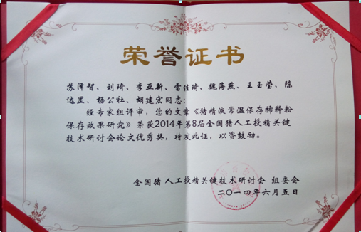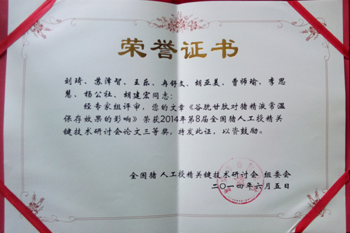 本次论坛在种猪市场日趋饱和、国内外市场竞争日益激烈的背景下,深入探讨了促进种猪事业发展,如何发挥猪人工授精在生猪遗传改良中的重要作用。在线炸金花 胡建宏教授带领研究生刘琦、朱林炜和苏泽智等参加了会议。刘琦等撰写的《谷胱甘肽对猪精液常温保存效果的影响》以及苏泽智等撰写的《猪精液常温保存稀释粉保存效果研究》论文分别荣获会议三等奖和优秀奖。