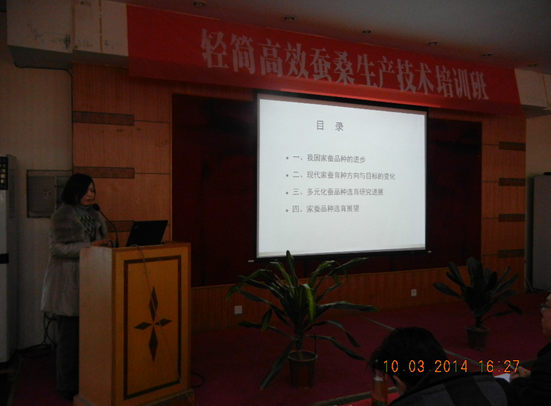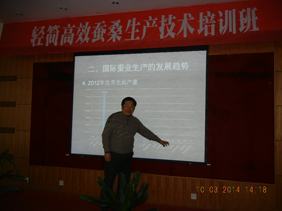 本次培训班为期5天,授课内容包括陕西省茧丝绸行业发展思路、国外蚕业发展状况、我国蚕桑产业多元化发展问题研讨、家蚕多元化育种进展和发展趋势、蚕桑资源开发利用现状和展望、现代农业与农技推广、蚕桑历史与文化、食用菌发展现状与趋势、蚕丝产业发展现状与趋势、果桑栽培技术、桑树轻简化栽培管理技术、轻简省力化养蚕技术、陕西省轻简高效蚕桑主推技术等。培训期间还安排有讨论交流、桑树专用肥的推介、桑树简易施肥器的现场观摩等相关内容。