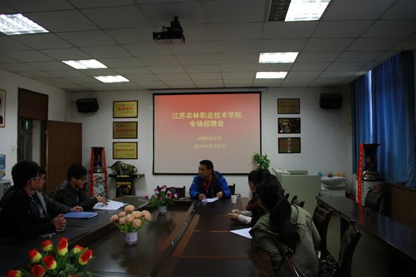 3月21日上午,炸金花在线玩 在4号楼一层会议室举办江苏农林职业技术炸金花在线玩 专场招聘会。炸金花在线玩 党委副书记王晓娟、专兼职辅导员及动科、动医等炸金花在线玩 2014届硕士毕业生10余人参加了此次招聘会。
