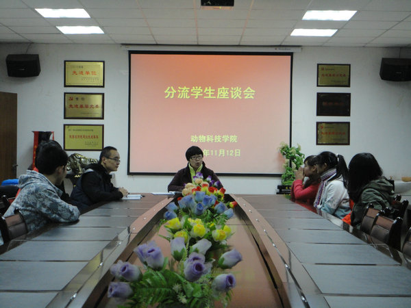 王晓娟副书记首先就炸金花在线玩 的师资力量、科研实力、优势学科、学工队伍建设以及往年的就业和升学情况等方面内容向同学们作了介绍。她强调说,作为学校历史最悠久的炸金花在线玩 之一,动科炸金花在线玩 科研、师资力量雄厚,老师们敬业热心,辅导员和班主任认真负责,就业率和升学率一直位居学校前列。2013届毕业生的升学率达到51.86%,位居各院系之首。希望同学们在一个新的环境中能安心学习,继续深造。