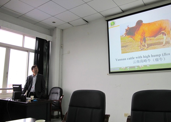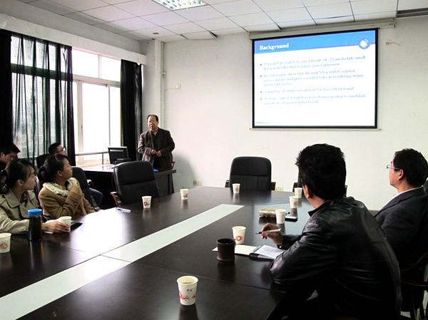 随后,陈宏教授及团队成员雷初朝教授应邀分别作了题为“秦川牛肌肉生长发育相关miRNA的筛选与功能研究”,雷初朝教授做了“中国牛种(黄牛、水牛、牦牛)mtDNA与Y染色体多样性研究与应用”的学术报告。陈宏教授介绍了miRNA的特征,重点讲解了如何筛选与肌肉生长发育相关的miRNA及其验证,并进一步对肌肉特异表达的miRNA的靶基因做了预测和验证;雷初朝教授以中国黄牛、水牛和牦牛为研究对象,重点讲解了线粒体D-loop区和Y染色体的遗传多样性及其进化分析。