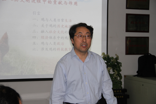 欧百钢处长从鸡与人类日常生活、鸡的历史地理、融入社会文化的鸡、经济体系中的鸡、鸡与人类政治、涉及鸡的科技教育等方面为师生作了一场精彩的报告。