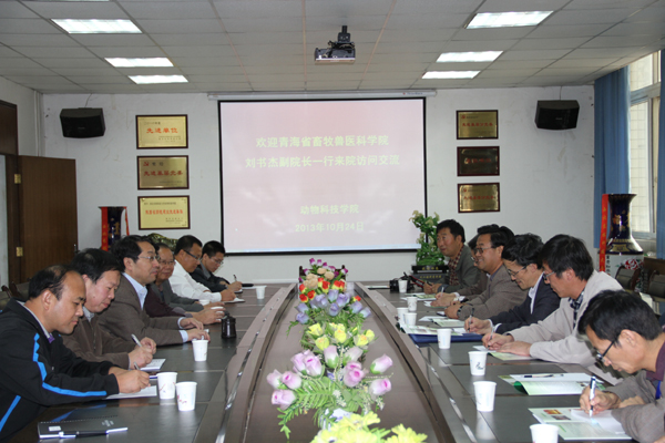 10月24日下午,青海省畜牧兽医科炸金花在线玩 刘书杰副院长一行8人来炸金花在线玩 访问交流。炸金花在线玩 院长姚军虎教授、副院长呼天明教授、陈宏教授、李青旺教授以及草业系、畜牧教学基地、实验管理中心负责人、办公室部分秘书等参加了座谈会。