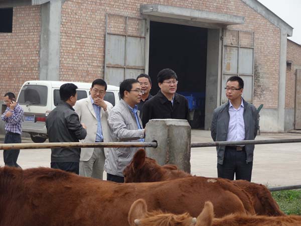 在陕西省秦川肉牛良繁中心杨凌基地,史高领副厅长一行实地查看了秦川肉牛育种基础群和新引进的澳洲安格斯牛繁育群,了解了良繁中心的繁育规模、运行机制和产学研合作等情况,肯定了秦川牛肉用本品种选育和安格斯牛纯种繁育工作,高度评价了校企结合培育秦川牛肉用新品种的工作。