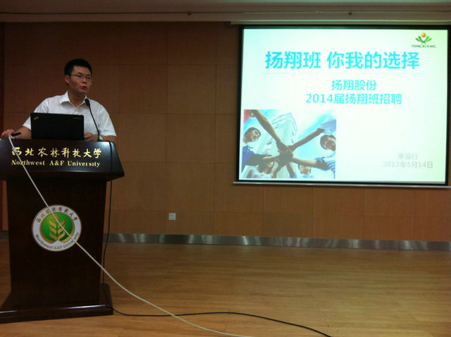 5月14日晚,扬翔股份有限公司在北校绣山活动中心北报告厅召开了2014届“扬翔班”招聘会。院党委副书记兼副院长王晓娟、扬翔股份有限公司招聘经理余运行、全体辅导员,以及来自动科、动医的56名本科生参加了招聘会。招聘会由扬翔集团人力资源部刘莎女士主持。