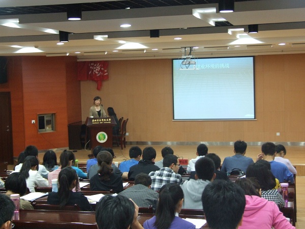 金宏宇女士首先将同学们的毕业去向如公务员、央企、外企、私企等做了吸引力排序,解读了当代大学生追求稳定、高薪的就业心理,指出了当代青年面对的购房、养家等方面生存压力,以及 “私企招工难、学生就业难”的社会现状。结合社会现实,金宏宇女士分析认为,随着国家与社会的进一步发展,稳定的工作岗位将会进一步减少,私营企业将更多地成为同学们的毕业选择。她希望同学们在应聘时认清自己的实力,对自己要有正确的审视,并积极进行换位思考。