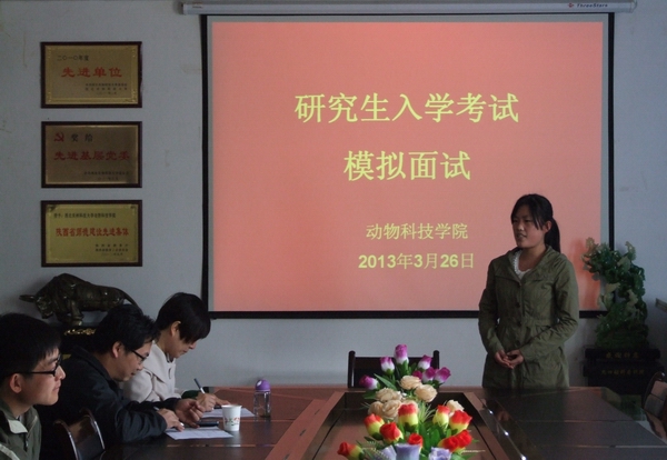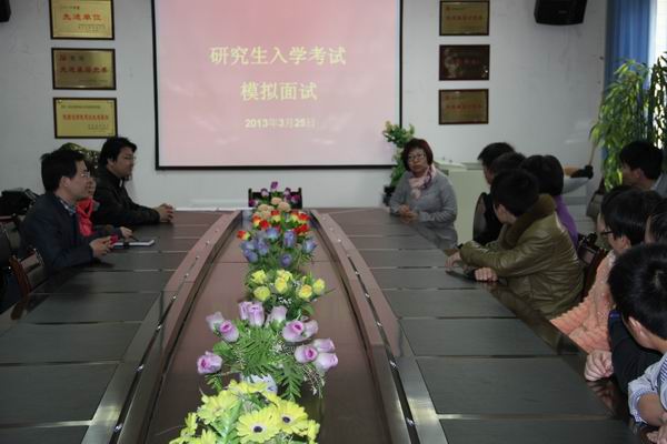 近期,炸金花在线玩 分别在四号楼一层和二层会议举行了研究生复试模拟面试。此次模拟面试活动邀请到了动物科学系蓝贤勇老师、史新娥老师、草业科学系刘海侠老师和水产科学系杨培志老师、研究生秘书阮鹏老师作为面试评委。共有40多名2013届考研同学参加了本次模拟面试。炸金花在线玩 副书记兼副院长王晓娟老师参加了活动。