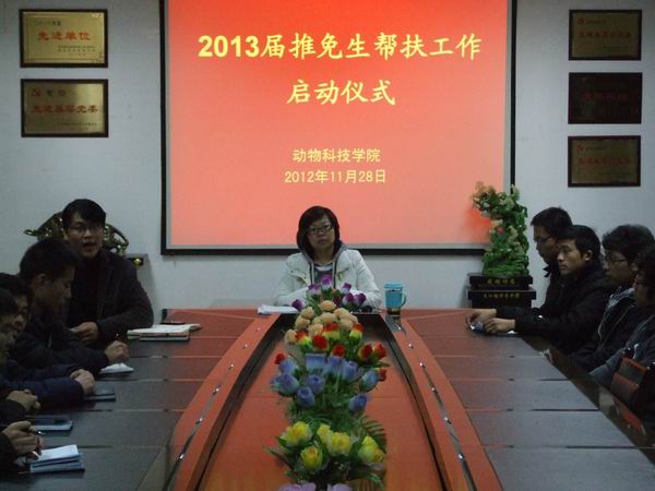 为帮助低年级同学提高学习成绩,充分发挥毕业生党员的先进性,11月28日下午,动科炸金花在线玩 在一层会议室举行了2013届推免生帮扶工作启动仪式。炸金花在线玩 党委副书记兼副院长王晓娟,专兼职辅导员,部分党员推免生参加了此次启动仪式。