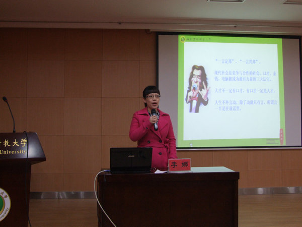 关于如何提高语言表达能力,李娜老师指出,拥有丰富全面的知识和良好的文化素养是提高口才的前提,口才所需求的精深而又简洁的语言源于知识的积累。她希望同学们在日常生活中能够广泛阅读经典,关注国家时政和社会民生,观摩和学习名人演讲。针对提高口才的方法,李娜老师结合自身经历,生动有趣地介绍了“速读法”、“背诵法”、“复述法”等多种口才训练方法和实用技巧,并不时地穿插提问和同学们互动交流,现场气氛热烈融洽。李娜老师还强调说,良好的口才并非天赋,靠的是后天的培养和积累。同学们通过自身不懈的努力完全可以达到很高的水平。
