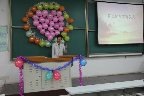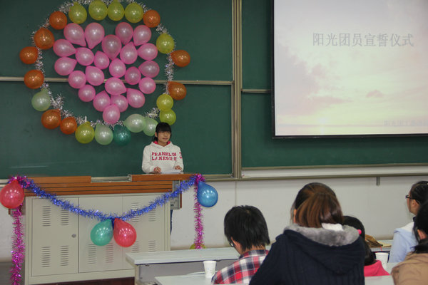 宣誓仪式在郭婷老师铿锵有力的讲话中开始,她简洁而有深意的讲话给予了在场所有阳光团员极大的鼓舞,老师还要求大家在今后的学习生活中能够以身作则,自强不息,并为其他学生做好表率。接下来,阳光团工委副书记石长沅做了发言,他以自己的亲身经历与大家分享了学会感恩与奉献社会的重要性。随后,阳光团工委动科支部负责人邓昌海,上届优秀团员代表王星星,以及新团员代表李亚新分别做了发言。最后,在优秀阳光团员代表任发的带领下,2012届阳光团员完成了庄严地宣誓,“自强不息,奋斗不息!”的口号响彻整个教室。