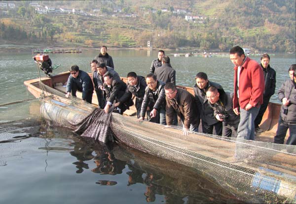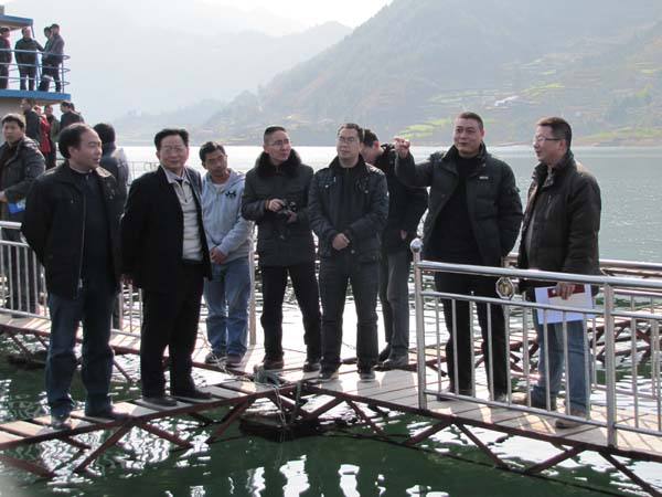 考察团先后参观了广元市水产良种场、广元市水产技术推广中心灾后重建项目基地、广元市水产科技园、青川县营盘乡水产养殖示范园区以及青川县白龙湖水产开发有限公司网箱养殖基地。考察过程中,考察团成员就养殖技术、苗种供应、今后发展等问题与白龙湖同行进行了实质性的沟通。青川县水务局水产办李凤岐主任向考察团详细介绍了白龙湖养殖、加工和市场等情况,并就养殖模式、组织化运作等养殖户尤为关注的问题进行了系统而深入的解答。获国家绿色水产品养殖示范基地认证的白龙湖库区的高标准生态网箱、规范运作的合作社、完整的产业链、始终确保Ⅱ类标准水质等突出成绩等都给考察人员留下了深刻的印象。