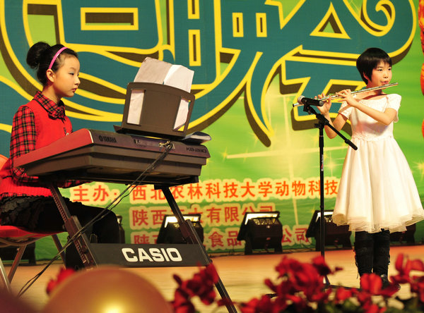 教工子女阮凌宇小朋友和她的伙伴为大家演奏《彩云追月》、《我的祖国》