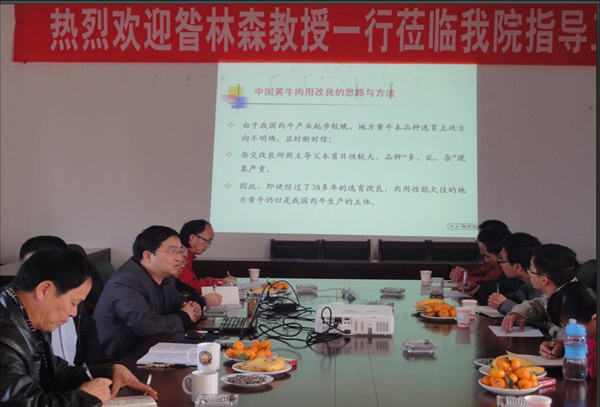 11月12~14日,国家肉牛牦牛产业技术体系岗位专家、副院长昝林森教授率领团队专家胡建宏副教授、王洪宝博士赴云南省草地动物科学研究院进行技术对接,就BMY牛选育改良及产业化工程开展调研指导和技术培训工作。期间,昝林森教授一行在云南省草地动物科学研究院院长黄必志研究员和国家肉牛牦牛产业技术体系昆明综合试验站站长张继才副研究员等的陪同下,参观了胚胎工程实验室、高营养糖蜜舔砖产品、肉牛屠宰中试车间和肉牛饲料加工厂,实际查看调研了婆罗门种公牛、BMY种公牛、BMY青年及后备母牛、断奶犊牛、大额牛及杂交后代等不同种群牛选育和饲养情况,在充分肯定该院目前科研工作进展的同时,昝林森教授还就进一步加强BMY牛选育、规范饲养管理、促进产业化开发等议题与黄必志岗位专家及团队成员、张继才站长及团队成员进行了交流,双方就高营养糖蜜舔砖产品在北方肉牛生产中进行中试推广达成了共识。结合此次调研工作,昝林森教授和胡建宏副教授还在云南省草地动物科学研究院为当地科技人员和肉牛企业技术人员分别做了题为“中国黄牛肉用改良的思路与方法”和“肉牛选种选配与繁殖技术”的专题讲座。