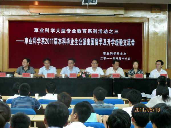 5月18日晚,草业科学系2011届本科生公派出国留学及升学经验交流会在7号楼二层报告厅举办。草业科学系特邀我校国际合作与交流中心副处长、留学服务中心主任乔文军、院长张智英、党委书记闫祖书、副院长呼天明、副院长姚军虎和副书记兼副院长王晓娟出席会议。草业科学系全体师生参加会议,会议由草业科学系主任龙明秀主持。
