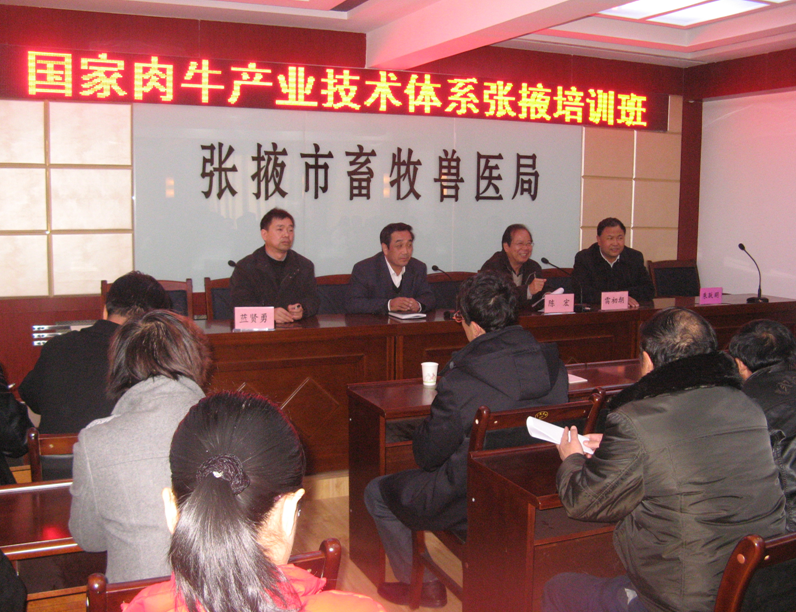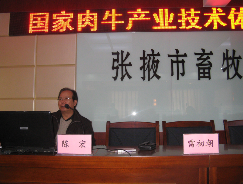 此外,该团队在张掖市畜牧兽医局会议室对来自张掖市6县区的畜牧兽医技术与推广人员进行了肉牛产业技术培训,陈宏教授作了“我国地方黄牛品种的保护、选育与杂交优势利用”的专题报告,并对张掖市目前肉牛选育改良工作提出了建议,比如:要确定肉牛选育改良的目标和技术体系,可以选育肉质好和生长快的2个肉牛杂交组合;分别建立2个肉牛杂交组合的核心母牛群。雷初朝教授的培训内容为“冬季肉牛的饲养管理技术”,蓝贤勇副教授的培训内容为“品种培育-杂交育种”。