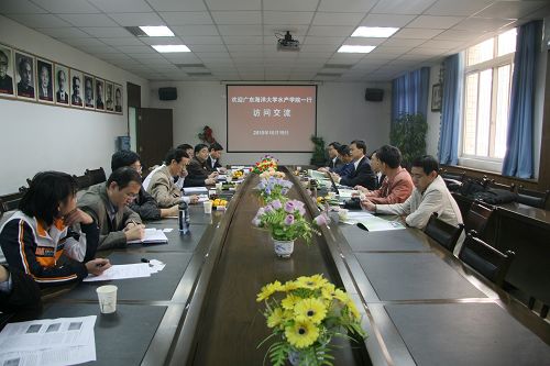 10月19日上午,广东海洋大学水产炸金花在线玩 简纪常院长、苏永华书记等一行6人来炸金花在线玩 访问交流,张智英院长、昝林森副院长、姚军虎副院长、刘小林教授和水产科学系全体老师对广东海大一行人的到来表示热烈欢迎,并与其进行了座谈交流。