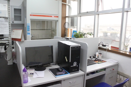 2、苏建国教授实验室约有42平方米,在合理规划实验操作区与与常规设备区的基础上,将实验台与窗户间有限空间(约4平方米)进行了合理改造,作为研究生学习区;同时将实验室东北角(约6平方米)进行了改造,作为教授办公室,既为研究生提供了学习与工作的空间,也方便了师生的交流。