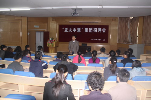10月29日上午,山东亚太中慧集团人力资源总经理潘维凯先生一行两人,在七号楼二层报告厅举行山东亚太中慧集团专场招聘会,炸金花在线玩 党委副书记兼副院长王晓娟、炸金花在线玩 和动医炸金花在线玩 辅导员及两院2011届毕业生70余人参加了招聘会。