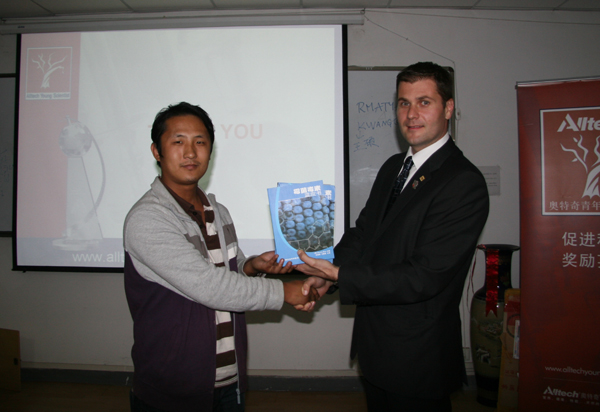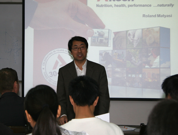 会上,Matyasi博士首先讲述了奥特奇动物保健公司30年成长历程及该公司设立的全球性青年科学精英奖基本概况,接着,包玉敏博士做了关于“通过动物营养调控改善动物健康”的报告,着重从基因层次上向同学们讲述了一种改善动物健康的高水平方法。