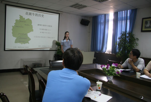 2010年9月17日,德国慕尼黑技术大学柏莫妮农业硕士应邀来炸金花在线玩 进行了访问与学术交流。柏莫妮硕士在炸金花在线玩 一楼会议室为炸金花在线玩 师生做了题为“德国花斑牛育种与繁殖现状”的学术报告,炸金花在线玩 相关教师及研究生参加了报告会。