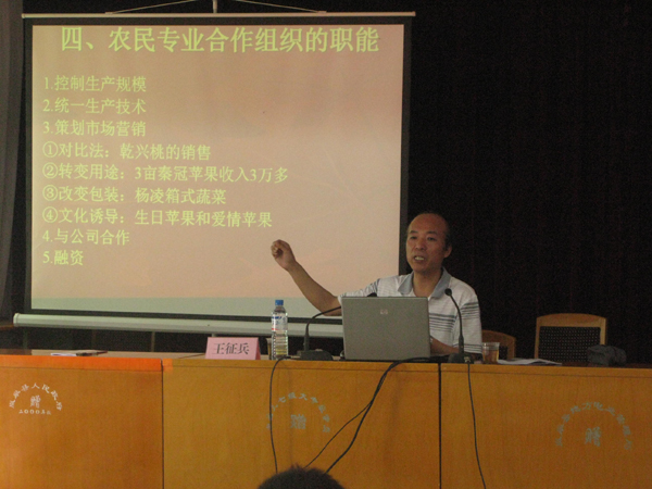 培训班上,王征兵教授就农业产业化发展过程中的农民专业合作社建设的必要性、合作社的职能、建设思路、方法以及存在的主要问题和对策等方面进行了全面系统的讲解,并与参会学员进行了互动交流。王征兵教授的讲座内容丰富、针对性强,学员们普遍反映受益匪浅。培训课程结束后,王征兵教授和试验站工作人员在地方领导的陪同下应邀实地考察了若干刚起步合作社的运作情况,并对合作社负责人和社员进行了具体的指导。