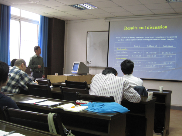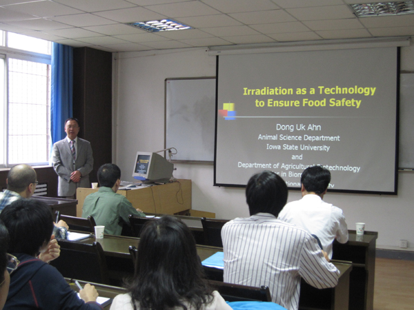 8月25日,应姚军虎教授的邀请爱荷华州立大学的Dong U. Ahn教授、张万刚博士来炸金花在线玩 进行肉品科学研究进展学术交流,并为炸金花在线玩 动物营养与饲料科学学科的师生分别做了“Irradiation as a technology to ensure food safety”和“Dietary oxidation regulates drip loss by protein oxidation in breast meat of broiler chicken”学术报告。