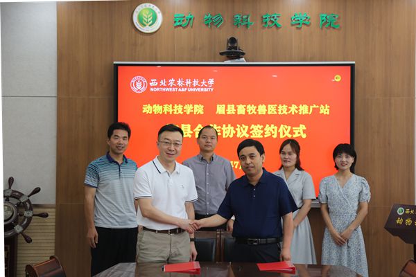 7月7日,炸金花在线玩 在104会议室与眉县畜牧兽医技术推广站签订校县合作协议。炸金花在线玩 党委书记曹军会、副院长王小龙,眉县农业农村局副局长刘艳丽、牧兽医技术推广站站长王勃森、副站长杨宏伟等出席签约仪式。