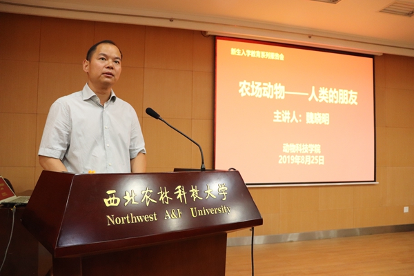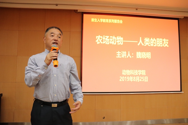 8月25日下午,炸金花在线玩 举办新生入学系列教育报告会之“农场动物——人类的朋友”。宁夏晓鸣农牧股份有限公司董事长魏晓明先生担任主讲人。会议由炸金花在线玩 党委书记曹军会主持,院长姚军虎,炸金花在线玩 党委副书记王力,2019级全体新生及部分新生家长参加了本次报告会。