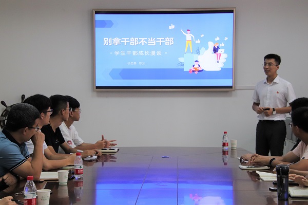 陈龙从自身经历谈起,以学生干部的职责、定位、自我要求和如何成长为主题,向现场的学生干部多方面深层次地诠释了“何为学生干部”。“我们要多发挥店小二精神,避免当官心理。”陈龙老师语重心长地总结到:“学生干部看似有很多权利,但这其实更是我们身上担负的责任,因此在大学这段能够最低成本犯错的时光里,我们遇到困难要学会‘复盘’,想到方法要大胆创新,真正在这段经历里得到修正、得到锻炼、得到提升,才能在未来的人生之路里,让这份特别的经历给你带来值得铭记一生的‘高光时刻’。”