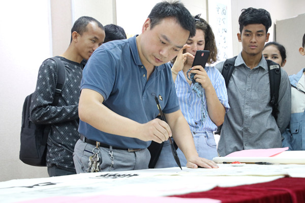 留学生学写毛笔字