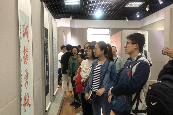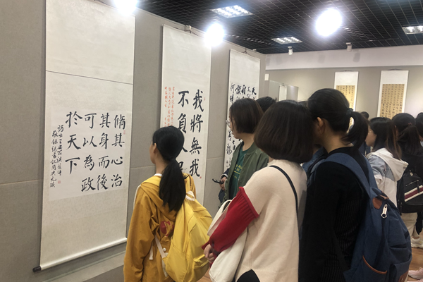 书法展的作品均由我校2018级本科生赵元琪创作,他的字力透纸背、大气磅礴,彰显出新时代青年朝气蓬勃的精神风貌。研究生第七党支部邬娇同学表示,此次书法展带给她极大的艺术享受与精神震撼,她为我校有赵元琪这样优秀的学生而自豪,也表示自己将继续努力,不忘初心牢记使命,为祖国的科创事业而奋斗。