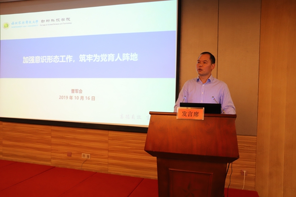 曹军会从四个方面介绍炸金花在线玩 意识形态工作的具体做法和经验成果。一是强化顶层设计,抓牢意识形态工作领导权。通过健全工作机制、压实工作责任、建强工作队伍等措施,巩固意识形态工作的“根据地”和“桥头堡”,坚守“主阵地”,种好“责任田”,旗帜鲜明地站在意识形态工作第一线。二是强化思想引领,掌握意识形态工作主动权。抓实科学理论武装,构建“党委理论中心组学习、教职工学习、学生党员学习、学生团员学习”的学习格局,积极推进习近平新时代中国特色社会主义思想入脑入心;抓好“先锋育人工程”“文化育人工程”“实践育人工程”三大育人工程,引领学生淬炼“诚朴勇毅”的高尚品格,践行西农精神。三是严格底线思维,掌控意识形态工作话语权。加强课堂阵地、文化阵地和校园网络阵地管理,构筑抵御宗教渗透“防火墙”,实现课程门门有思政、教师人人讲育人,把文化活动打造成为育人的平台,让新媒体平台始终高举旗帜,围绕中心、服务大局,师生树立正确的国家观、民族观、宗教观。四是加强文化建设,营造意识形态工作良好氛围。凝练“畜德自牧,富饶天下”的炸金花在线玩 文化,举办畜牧先贤百年诞辰大力弘扬科学家精神,开展丰富多彩的文化活动统一思想、凝聚共识,汇聚炸金花在线玩 发展正能量。