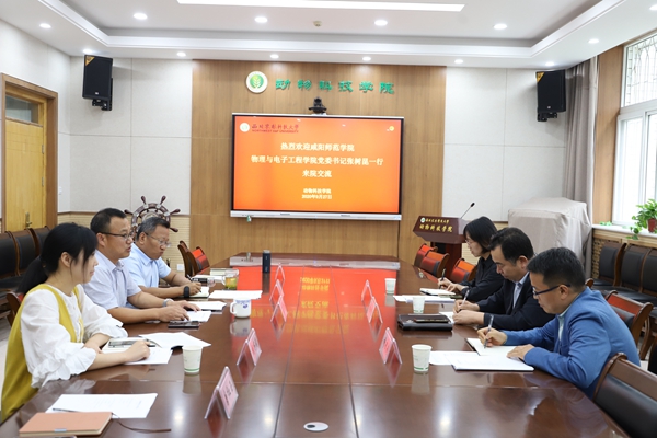 9月27日下午,咸阳师范炸金花在线玩 物理与电子工程炸金花在线玩 党委书记张树昆、党委副书记袁月、学工办主任穆武超一行3人来炸金花在线玩 交流工作。炸金花在线玩 党委副书记王力、副院长赵运良及办公室相关同志与张树昆书记一行在炸金花在线玩 104会议室进行座谈交流。
