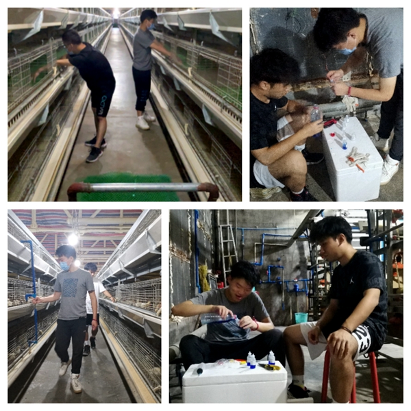 通过前期铺育雏网等工作,同学们慢慢适应了鸡舍的高温环境,熟悉了鸡舍的构造和结构功能。在7日龄疫苗接种时,三名同学就初步担任起了技术员的工作,负责疫苗的稀释和分发,在此期间同学们不仅掌握了疫苗的保存、稀释、注射等方法,还通过和技术员交流,对鸡新城疫、禽流感和传染性支气管炎的危害及防治有了新的认识。张纪桥同学说:“在规模化养殖中,肉鸡的生长是一个快速高效的过程,疾病的侵袭会导致鸡的发育受阻,所以在养殖场,疾病预防的重要性远远大于治疗,前期疫苗接种到位与否直接关系到后期的发病风险。其次,在育雏阶段,还要及时发现和主动淘汰残弱鸡苗,把损失降到最低。”
