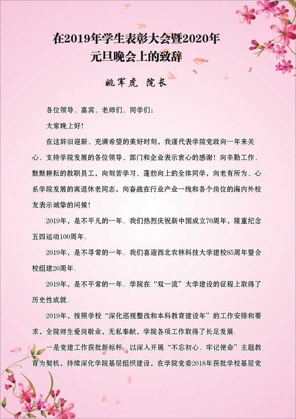 院长姚军虎教授在2019年度学生表彰大会上的新年致辞