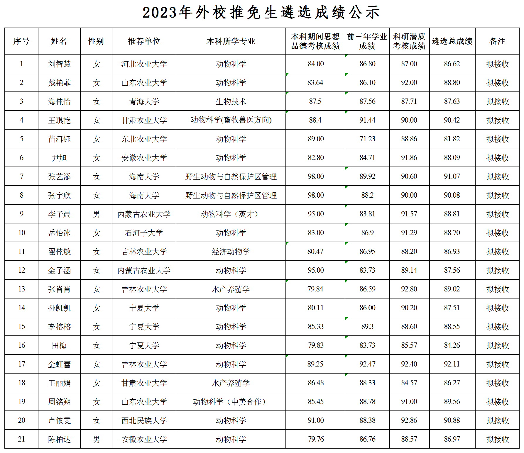 根据《在线炸金花 关于做好2023年接收优秀应届本科毕业生免试攻读研究生工作的通知》,经个人申请、专家组考核、炸金花在线玩 推免生遴选工作领导小组审核,现将外校推免生遴选成绩予以公示,公示时间:2022年9月26日至9月28日。