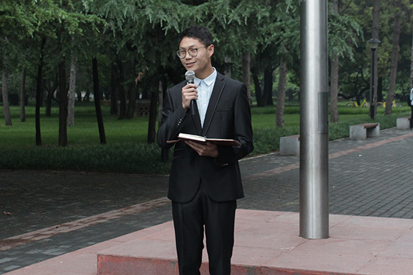 激昂雄壮的义勇军进行曲结束后,动科1604班魏昌盛同学在发表了激情澎湃的国旗下的演讲。他由刚刚过去的“520节日”联系当今时政,反问:“在当今青年热衷于庆祝网络流行节日之际,可曾主动了解过 ‘一带一路’国际合作高峰论坛等与中国社会发展息息相关的时政大事?”大学之道,在明明德。他呼吁大学生应明确时代赋予的历史使命,修身、齐家、治国、平天下,为实现中华民族的伟大复兴而不懈奋斗。一番真诚而又掷地有声的话语深深地触动了学子的爱国情怀,现场掌声热烈不断。