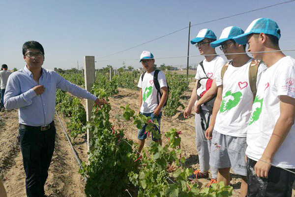 醒目突兀的欧式大门,一望无际、绿意葱茏的葡萄田,临沙傍水而建的葡萄庄园,静谧和谐,尽显辽阔神秘之美,犹如人间胜地一般的景象正清晰地呈现在在队员们的眼前。7月11日,炸金花在线玩 赴甘肃武威一带一路与葡萄酒产业发展调研服务队来到了位于武威市郊的威龙有机葡萄酒庄园。在庄园负责人杨彦军总经理的带领下,队员们实地考察了葡萄酒庄园,了解了武威有机葡萄的种植规模及发展历程。