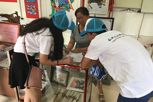 “您这画全部都是手工制作吗?”“年画每年的收益可观吗?”成功抵达绵竹木板年画传习基地后,队员们对基地李强老师进行采访,他谈到:“绵竹年画是四川人民的骄傲,也是中国人民的骄傲。随着人们对于传统文化日益关注,绵竹的年画的发展也呈现上升趋势,整个年画村的游客量日益增加,收入相对可观”。在工作人员细致地讲解下,队员们对绵竹年画的历史以及部分制作工艺流程有了进一步掌握,除此之外,队员们还采访了一位来年画村旅游的女士,她表示:“传统文化是中华民族的瑰宝,作为中国人,咱们要珍惜。”