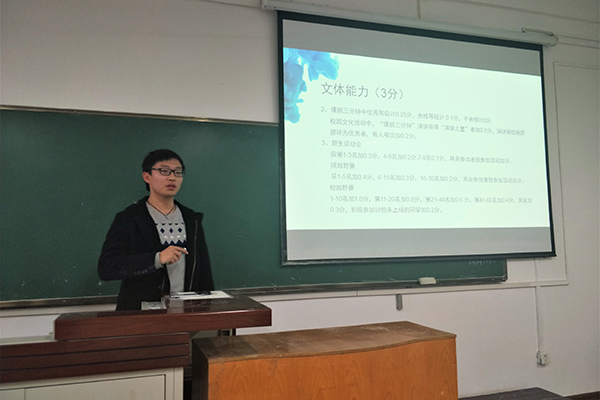 在十九大的胜利召开之际,为让炸金花在线玩 新生担负起肩上的责任、明晰大学学习生活发展方向,并深刻了解创八、综测、阳光课时等重要评审体系,增强新生的规则意识,明确新生的课余学习任务,炸金花在线玩 秘书处、勤工外联部与科创部于10月22日在三号楼212教室联合举办了综测创八阳光课时制度宣讲大会。出席本次大会的团学干部有秘书处处长丁彦之、勤工外联部部长赵慧、科创部副部李奕洲等人。此次会议还邀请到了校团委素质拓展中心副部长张志浩参加会议,另参与本次会议的有17级各班班长支书、勤外委员、科创委员及阳光团员代表。