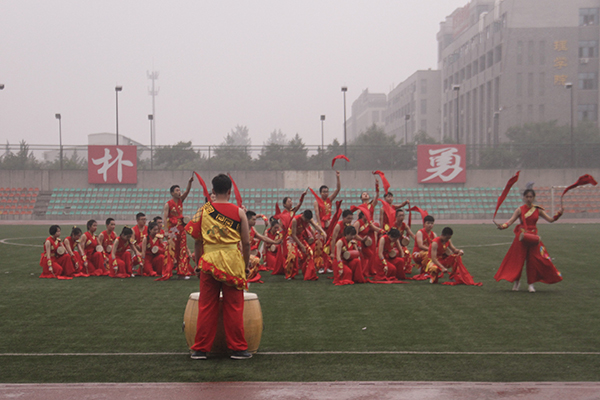 阴雨绵绵,浇不灭似火的热情、挡不住激荡的鼓声。“鼓声震天响,红绸随风飘”,比赛过程中,炸金花在线玩 36名同学组成的腰鼓队热情洋溢,动作激昂,气质纯朴,他们用自己独特的方式传承腰鼓特色文化,用自己的理解演绎着安塞腰鼓中的坚毅精神——“知难而上的猛劲、张扬个性的能劲、百折不退的韧劲”。不畏强敌,他们有着"会当凌绝顶,一览众山小"的自信!奔放的舞姿与陕北独特的嗓音充分展示出炸金花在线玩 良好的精神风貌,为观众诠释了一场别开生面的视觉盛宴。观众席上,炸金花在线玩 团工委书记、各级辅导员、学生会成员等都前来一起为参赛队员们加油喝彩。“动科风魂,舞动青春”的口号响彻田径场上空,同学们震耳欲聋的呐喊给了队员们最有力的支持,也让各院师生都感受到了动科精神。