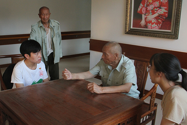 “你们是大学生吧!”正在队员们准备进屋时,身后突然传来了浑厚有力的声音。一位面容坚毅的老兵在身后叫住了队员们,并热情的拉着大家围坐在大厅中的桌子边,开始讲述他的故事。同京飞老人已年逾90,身着军装,腰板挺直,声音浑厚,口中吐出的是70年前那段烽火岁月……“日本人有飞机,打到最后我们全连只剩6个人,但是大家还是拼到了最后走一刻。”1942年,同京飞跟随部队奔赴山西抗战前线,并在惨烈的战斗中英勇作战。抗战胜利后,国民党大局进攻陕北,在与胡宗南部的战斗中,他曾与战友在战壕里三天三夜滴水未进。“只要是想起牺牲的战友们我就伤心,天天说话玩耍,一场战斗之后可能就没人了……但是我们也从未害怕过,老百姓想要过上好日子,就要先把敌人赶走!”说到动情处,老人眼里泛着泪光。听闻队员们来自在线炸金花 ,老人更加精神了,原来他的孙子正于我校攻读硕士研究生。“你们年轻人,大学生,一定要好好读书!将来造出比国外更先进的飞机导弹,我们国家才不会被欺负!看到现在许多年轻人在大学不好好读书,只知道上网打游戏,我就心痛啊!”队员唐红玉急忙紧握住老人饱经风霜的手说:“爷爷您放心吧!我们一定会好好读书的!”老人也欣慰地笑了。
