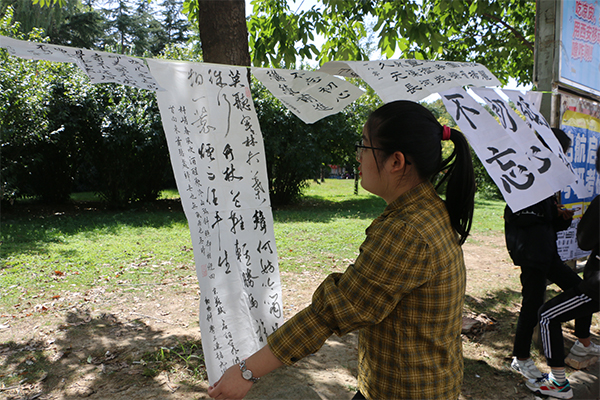 10月10日,组织部于西区雕塑举办展览,展出国庆期间的优秀书画作品。恰逢阳光明媚,秋风送爽,烫金的宣纸上字迹飘逸隽秀,墨香逸散;一幅幅随微风飘荡的绘画作品或满含同学们对祖国的祝福,或印下祖国的繁华盛世、大好河山……路过的同学们纷纷驻足欣赏,很多同学拍照留念。参加了本次活动并成为优秀作品作者的赵元琪同学表示:“本次活动给了我很深的感触,当我将平时存于心中的爱国情感运于笔尖、落在纸上之时,我可以清晰地感觉到那种激情在心中澎湃。我书写了一幅楷书《七律·长征》,寓意伟大祖国走好新时代的长征路,实现中华民族的伟大复兴。”