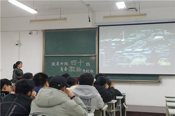 四十年来,在党的正确领导下,中国人民扬鞭奋蹄,迎潮搏击,国家发展跨越了一个又一个台阶,大踏步迈进一个全新的时代。新时代,新责任,新青年,习近平总书记说“青年强,则国家强”,青年大学生更应挺立时代潮头,为实现中华民族的伟大复兴奋斗扬帆。从各班同学的发言中可以展现出每个人对于改革开放的新感悟:在为祖国强盛而骄傲自豪的同时,也决心艰苦奋斗,成为新时代优秀青年,为祖国发展事业添砖加瓦。