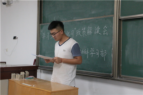 解读会上,耿慧君,赵冬玥等同学宣读了各项文件,组织学生重点学习《在线炸金花 关于进一步加强大学生学风建设的实施意见》、《在线炸金花 本科生学籍管理办法》和《在线炸金花 教学区学生文明行为规范》,特别是学籍管理办法中关于学习考核与成绩记载的相关内容,加强政策解读及宣传,确保学生能了解并熟知政策变化及影响。