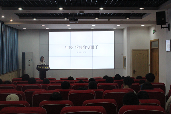 严堃同学一开始向大家介绍了自己大学四年来所获得的荣誉,包括校级实践先进个人,院十佳歌手等,简单的介绍了她优秀而又充实的大学生活。之后,严堃同学说到,几乎所有人在生活中都会有所碰壁,在碰壁之后,同学们应该用乐观的心态,将悲愤转换为动力,积极的面对生活。所谓年轻,就应该有朝气,有活力,就应该负重前行,不惧怕失了面子,也不惧怕彷徨与碰壁。