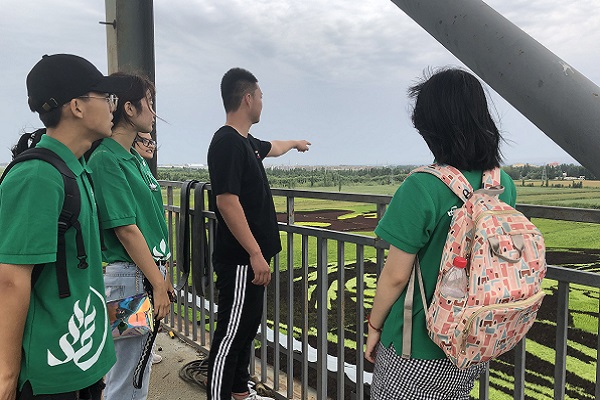 下午,队员们乘车来到了久负盛名的“稻田画”产业示范基地。一下车,一眼望不着边际的稻田就映入眼帘。新疆洲盈信息科技有限责任公司负责人带领队员们登上了观光塔。在观光塔上,面对着色彩斑斓的稻画与此起彼伏的稻浪,队员们由衷的感受到了稻田画的无穷魅力与稻田画工作者的智慧。在该公司负责人的讲解下,队员们了解到了稻田画目前正在完善,今年加入了“哪吒闹海”等彩稻图案,还增加了玻璃栈道、“天空之城”等游乐项目。公司从广东和东北引进彩稻品种,在原先黑色、紫色、黄色和粉色的基础上,新增了红色和白色两种彩稻,由专业人士进行稻田图案设计。为了让这幅架构复杂的图案更加栩栩如生,35名工人采用矢量法定点桩连线人工填色的方法几乎忙了20天。现在,随着国产动画电影《哪吒之魔童降世》的热映,该图案一定会吸引更多人前来参观。负责人向队员们讲解道:“这些土地都是农民通过土地流转而来的,农户每一年都会获得有保障的收入,公司同时也雇了许多村民长期耕田,不论是施工亦或今后的运营,我们都会安排村民参与其中。”