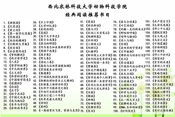 书单中包括125本著作,涵盖哲学、社会、文学、历史、政治、经济、管理、科普等多个领域。既有《道德经》、《论语》等体现中国优秀传统文化、深植于国人基因的国学经典,又有《理想国》、《社会契约论》等反映世界优秀文明成果的西方原典;既有《史记》、《沉思录》等思想内容历久弥新、永不过时的古代名著,又有《摆脱贫困》、《百年孤独》等内涵丰富、具有强烈时代精神的近现代佳作。炸金花在线玩 希望通过引导学生阅读经典,培养学生爱读书、读好书、善读书的良好习惯,培育自主学习、合作学习、探究式学习的优良学风,促进学生全面成长成才。
