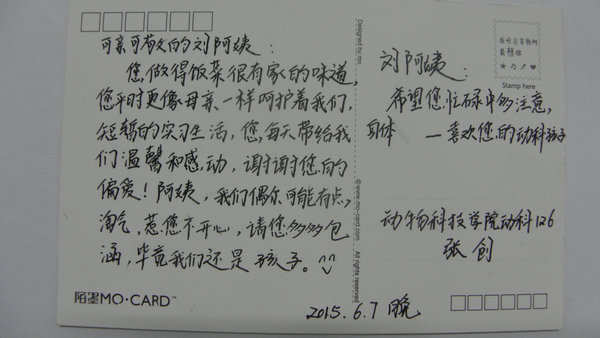 在实习即将结束之际,同学们纷纷向三站的老师和服务人员送上由衷的感激和祝福。动科126班张创同学在给食堂阿姨的明信片上写到:“您做的饭菜有家的味道,您平时更像母亲一样呵护着我们,您每天带给我们温馨和感动。希望您忙碌中多注意身体――喜欢您的动科孩子!”