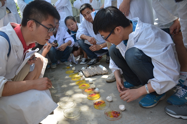 6月9日,在孵化车间,动科123班同学仔细听取了实习指导老师有关孵化知识的介绍后,同学们小心翼翼端出一盘正在孵化的鸡蛋,用照蛋器检查种蛋发育状况,剔出无精蛋和死胚蛋。接着,从5天到21天孵化的鸡蛋被同学们小心翼翼一个个打开,各自放在玻璃器皿中仔细观察,这让第一次亲眼观察到胚胎发育情况的大家惊叹不已,并感受到生命的神奇。